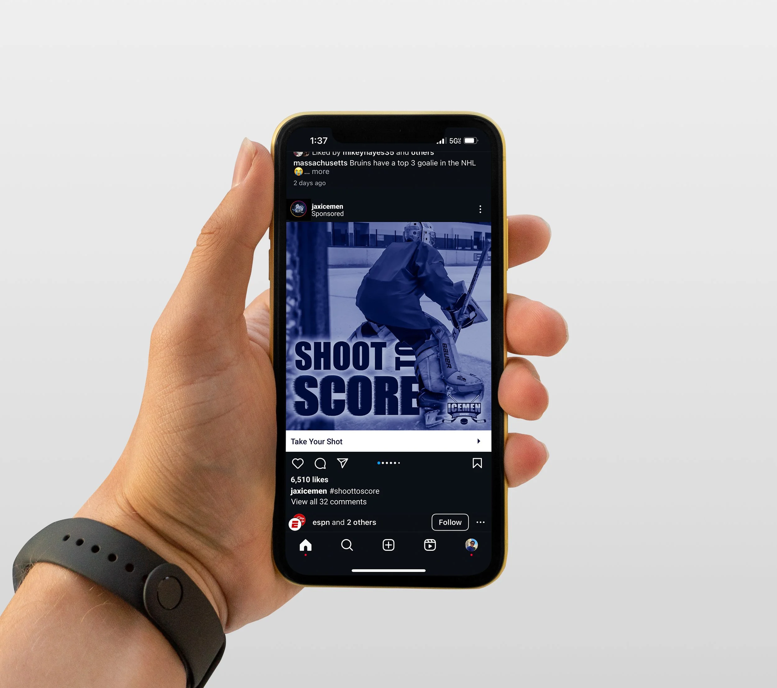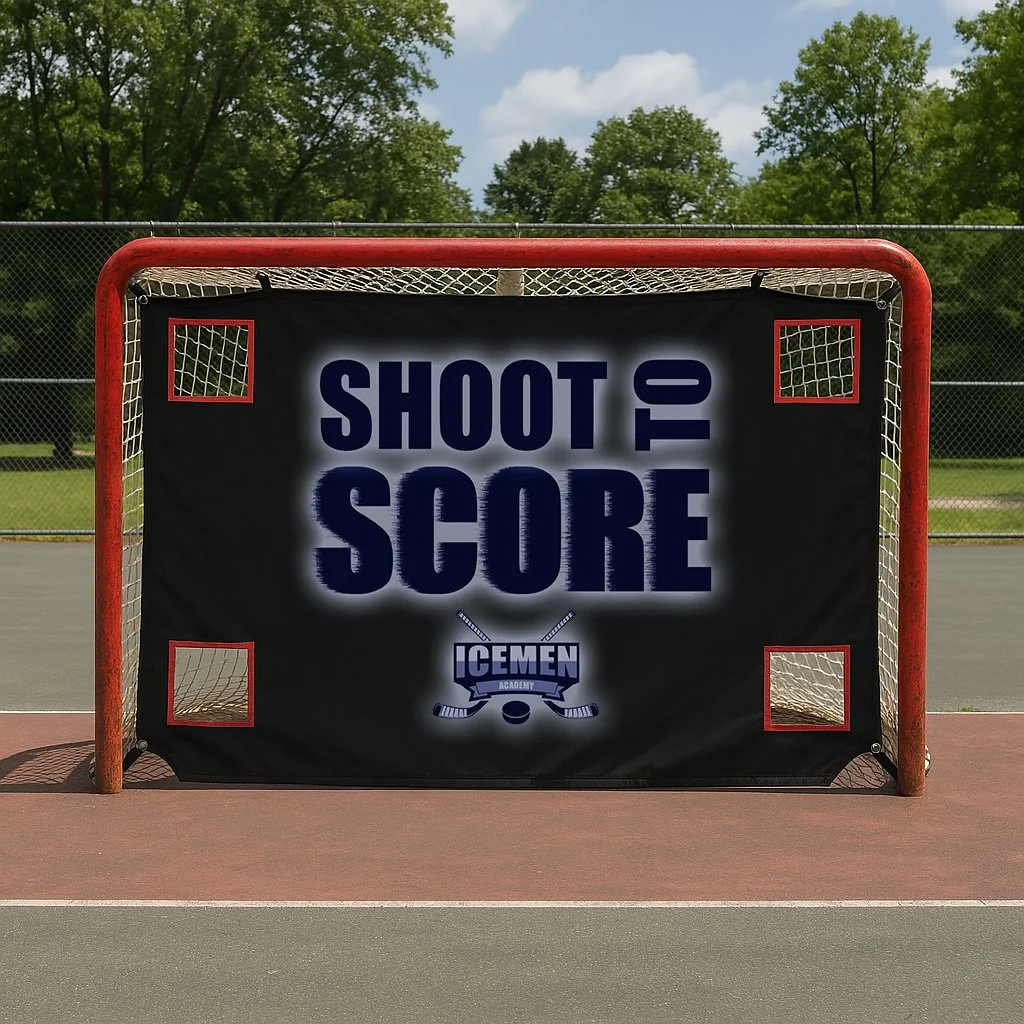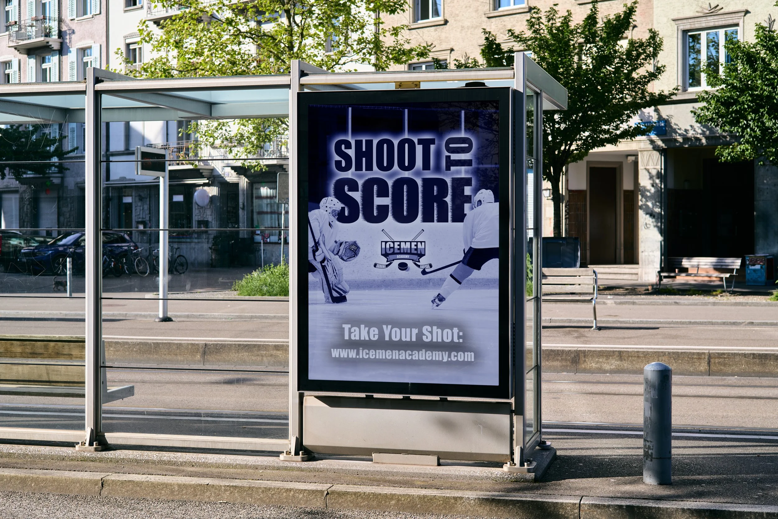 The campaign includes a bus stop ad, billboard, Instagram ad, and an interactive shooting tarp. The print and digital ads all feature the academy website and strong visual messaging, encouraging parents to take action. The shooting tarp provides a practical, after-hours training tool for kids without goalies, reinforcing the idea that Icemen Academy is always there to help players improve. Across all formats, the campaign balances inspiration with trust, positioning the academy as a place where young athletes can shoot to score.